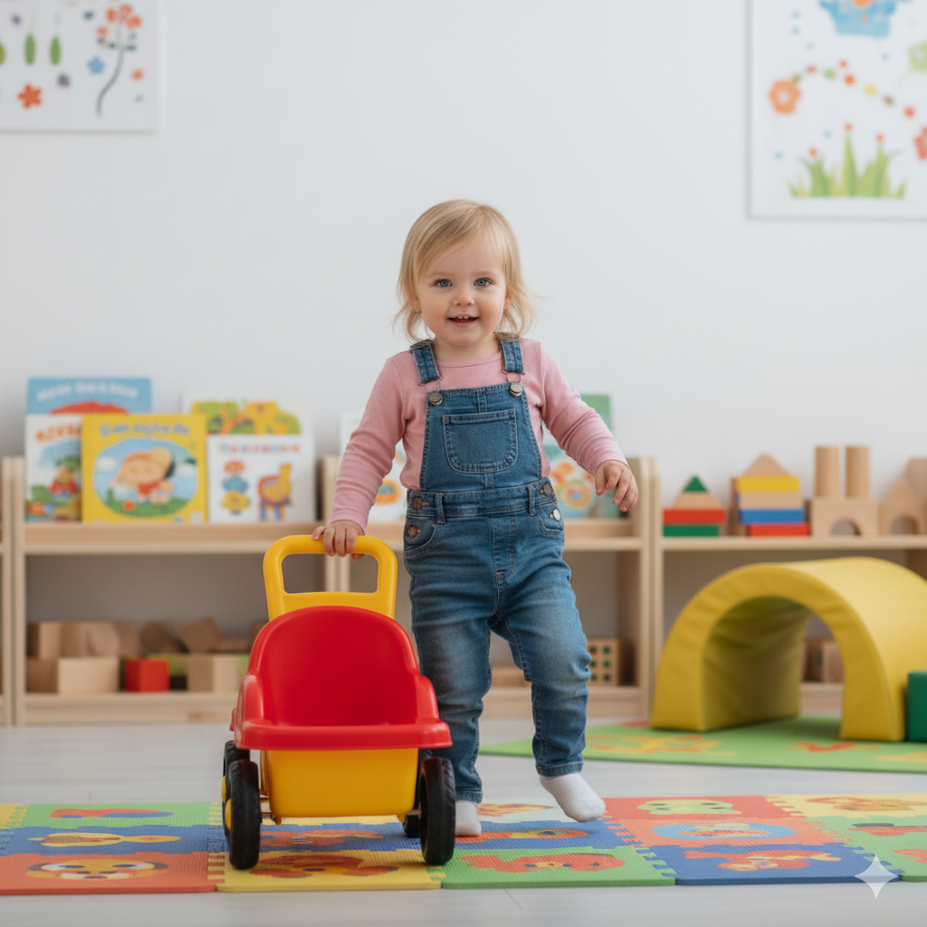 Transition to toddlerhood, marked by rapid physical independence. Children master walking, refine fine motor skills, and jump from single words to two-word phrases. We focus on fostering their autonomy and introducing early boundaries